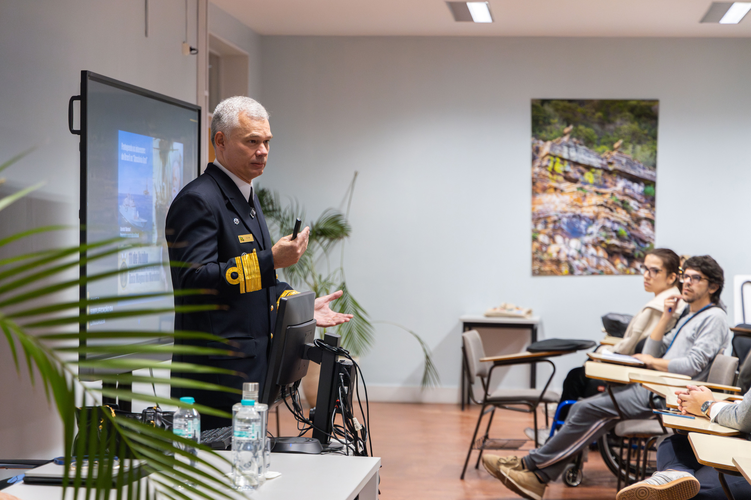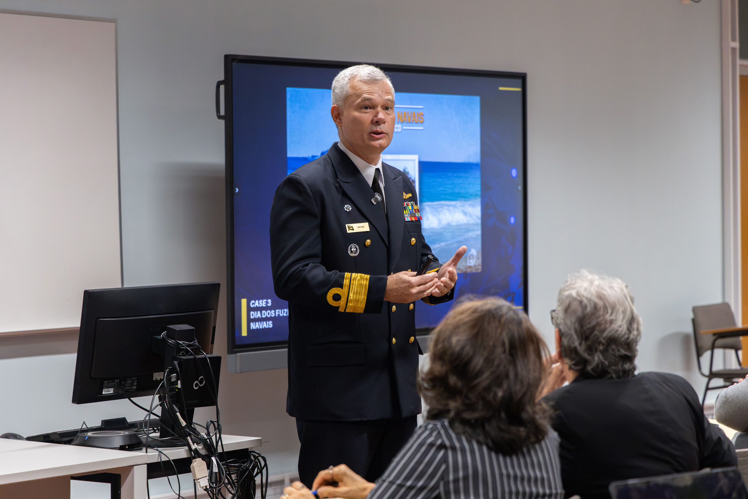 Ao longo da sessão, o Almirante Pavoni apresentou a abordagem da Marinha do Brasil à comunicação estratégica, destacando a importância da articulação entre a comunicação institucional, os contextos operacionais e a projeção da imagem da instituição junto da sociedade.