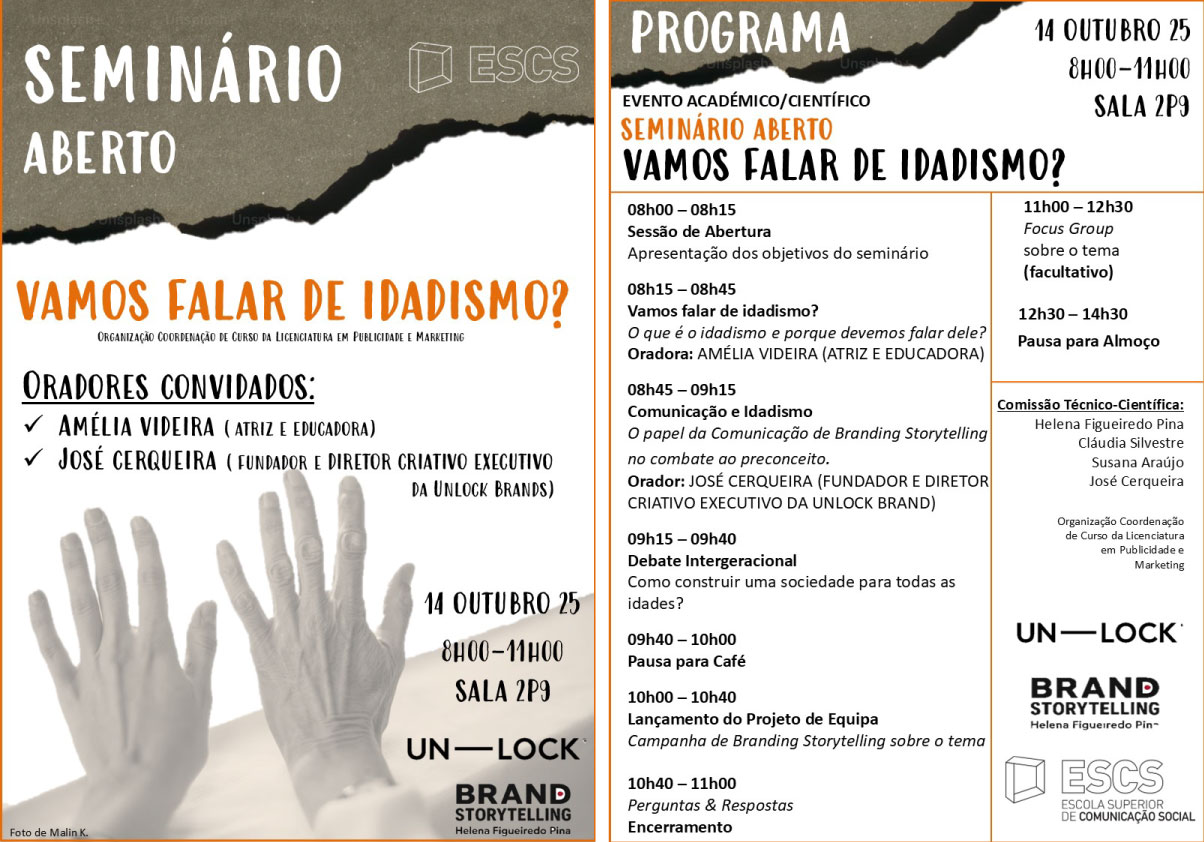 No dia 14 de outubro de 2025, a Coordenação da Licenciatura em Publicidade e Marketing promoverá um Seminário Aberto, das 8h00 às 11h00, na sala 2P9. O evento contará com a presença de convidados externos: a atriz Amélia Videira e José Cerqueira, fundador da Unlock Brands.